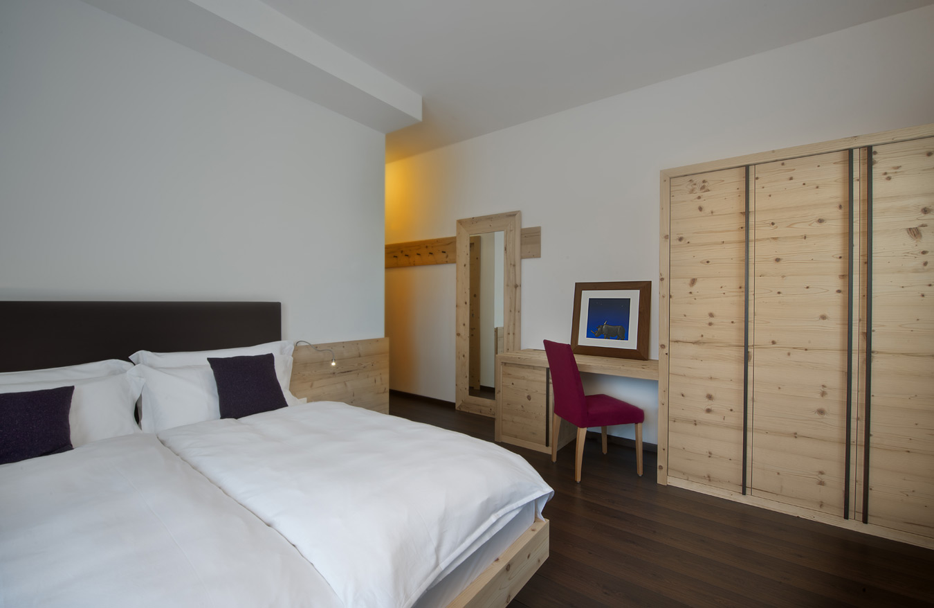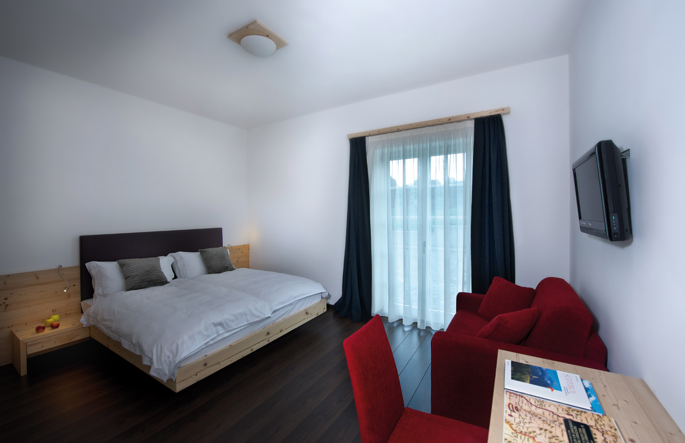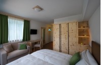 Di circa 26 m², può ospitare da 2 a 3 persone, la stanza è completamente arredata in moderno design alpino in essenza di cirmolo. Ampia, chiara e luminosa, dalle linee semplici e curate, il gioco creato dai nodi del legno, il ferro grezzo per i dettagli e della tappezzeria nei toni naturali donano all'ambiente un aspetto caldo ed elegante.