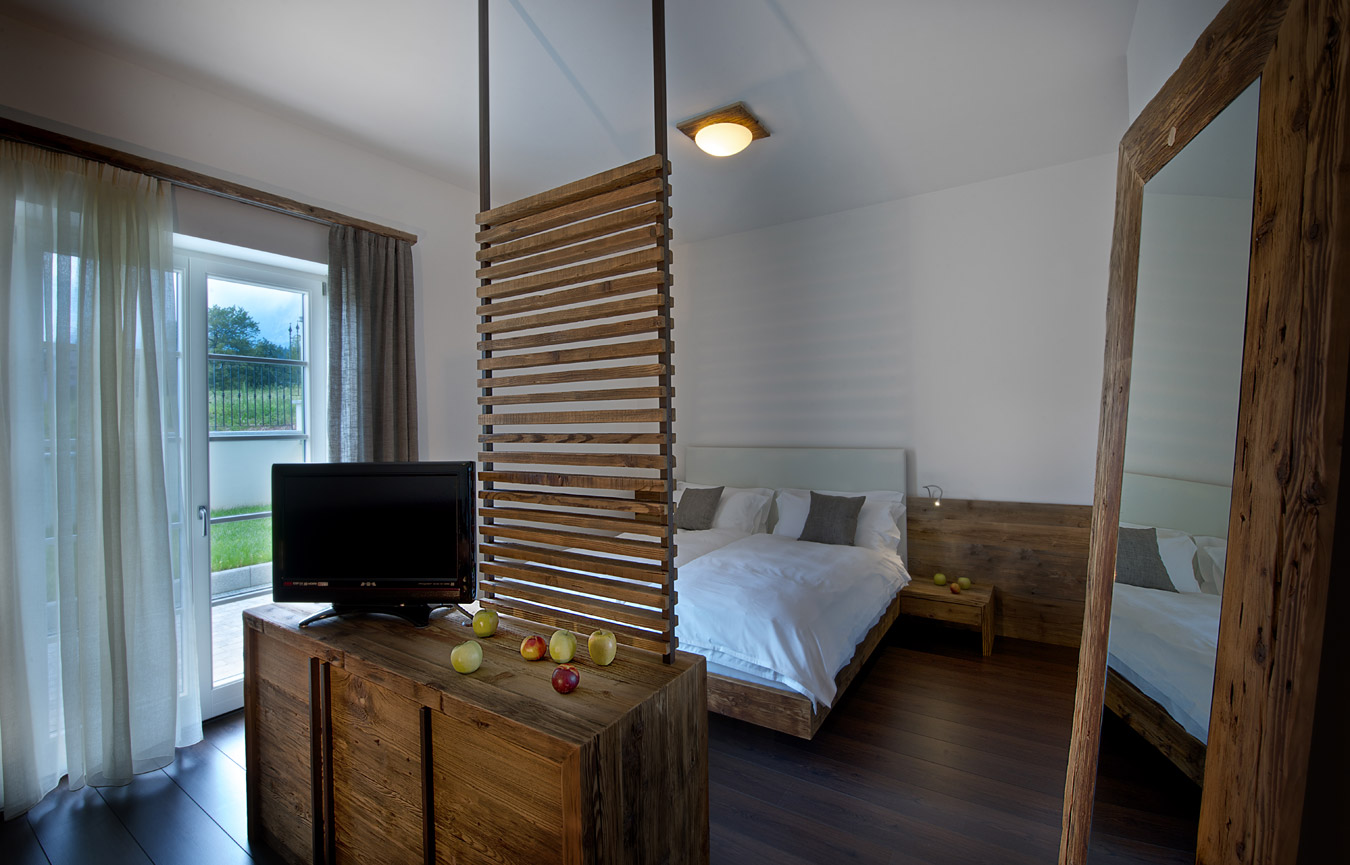 In larice vecchio, dai toni caldi, marrone, arancione, fino al nero, i tessuti morbidi di lino, le rifiniture di ferro grezzo, il contrasto tipico della montagna: la dolcezza e la forza. Un ambiente da sogno dove trascorrere momenti di relax da non dimenticare. Con una metratura di circa 30 m² può ospitare da due a quattro persone, la stanza è così distribuita: la zona notte con il letto matrimoniale, separato da una grata di legno e ferro il divano che può ospitare 2 persone, una piccola zona lettura. Adiacente il bagno con servizi e doccia. La stanza offre la possibilità di uscire direttamene in giardino, a disposizione tavolino con sedie e lettini prendisole. Vista a sud verso la Paganella.